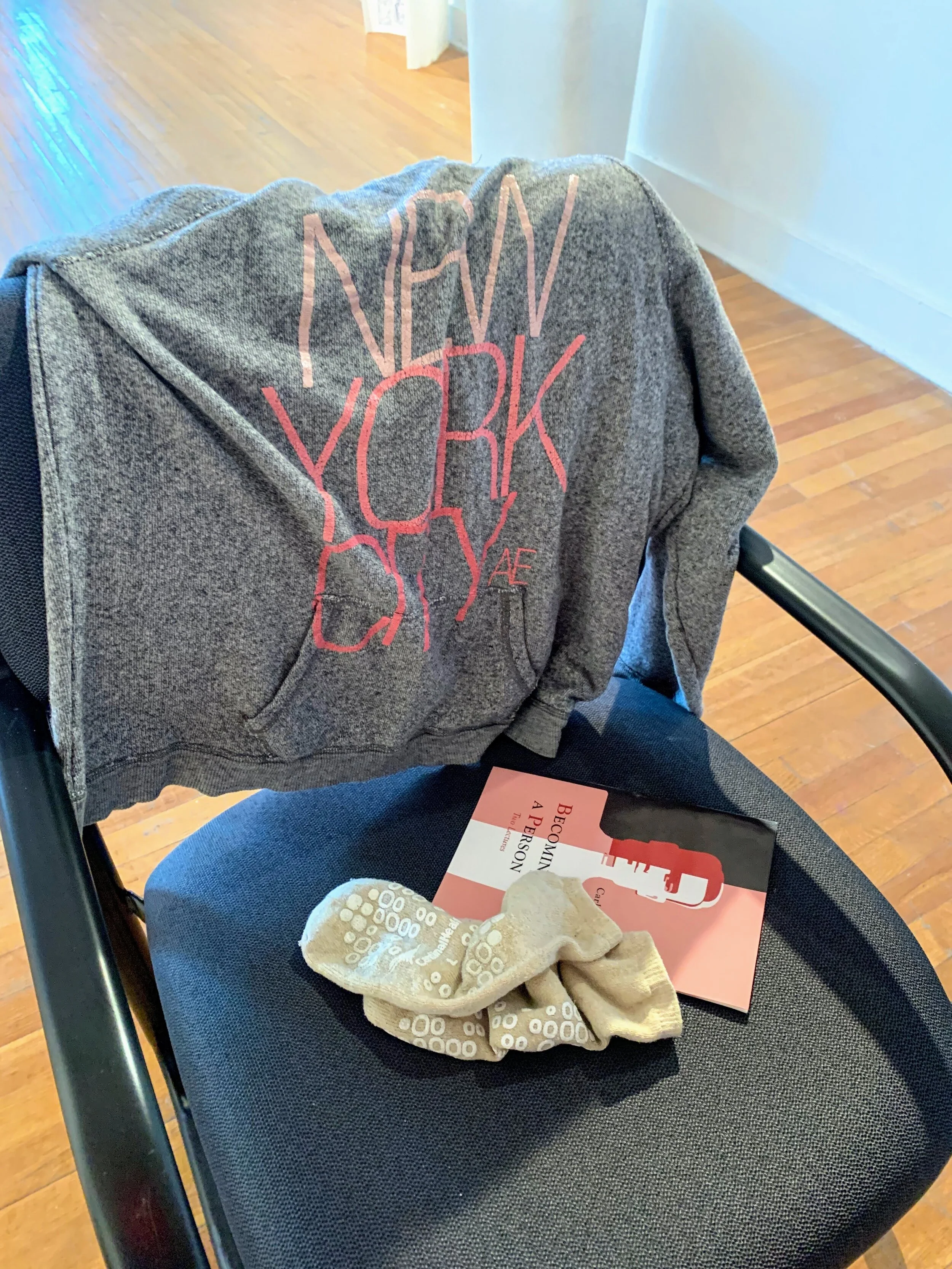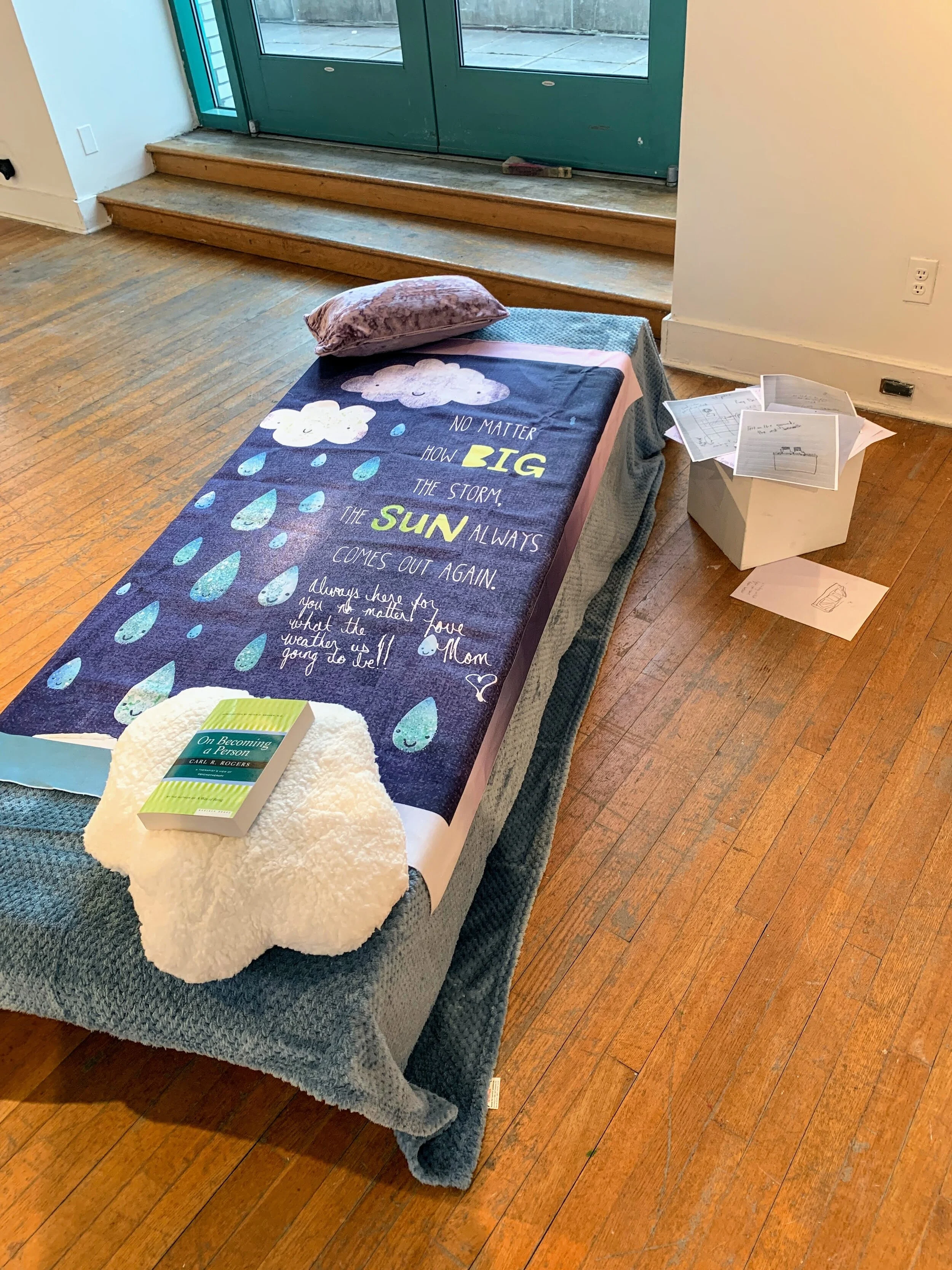 Additional Descriptions: fabric printed with an enocuragement card from mama. A station to process the show’s big concepts in a comforting envirnoment.