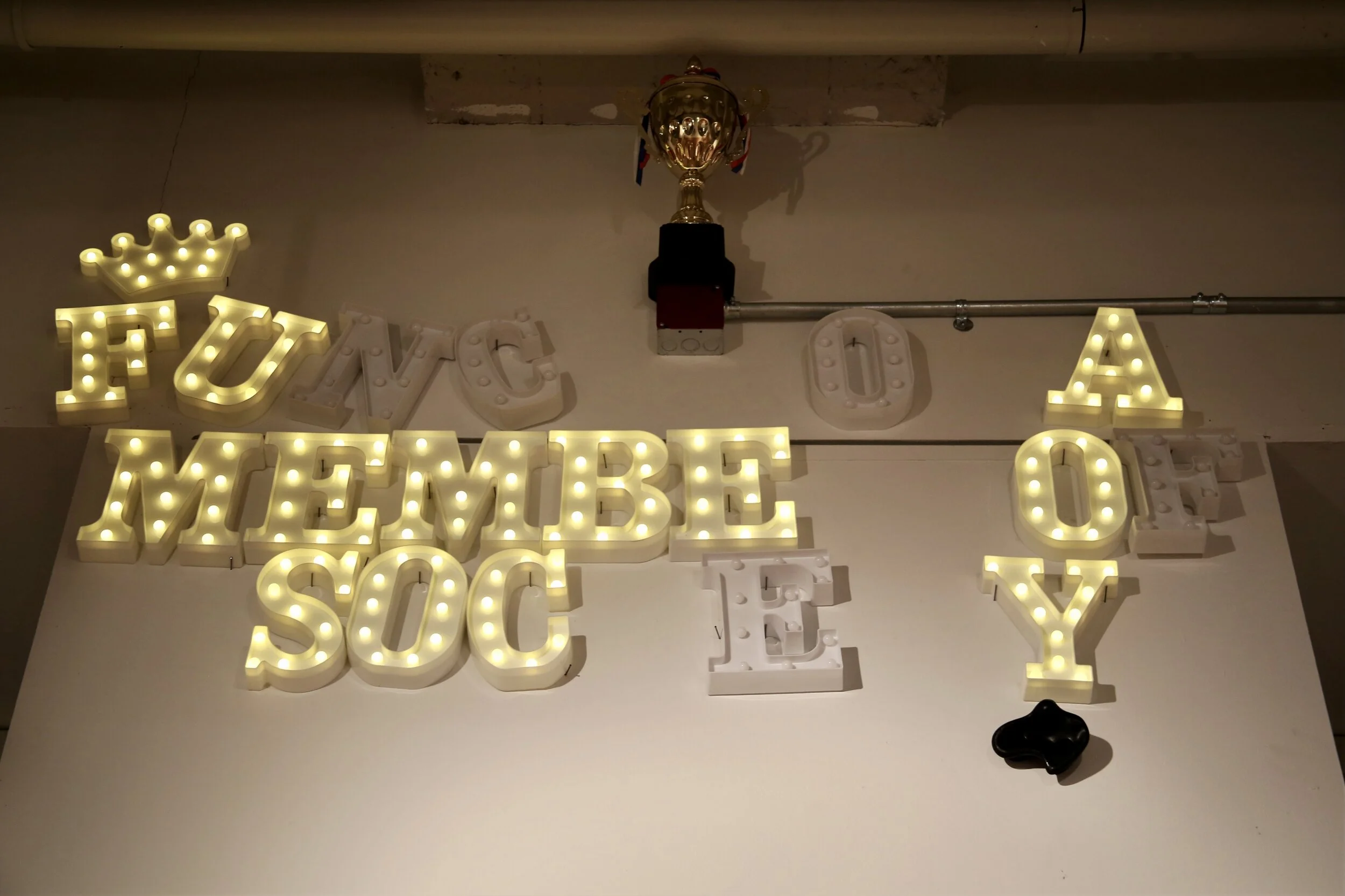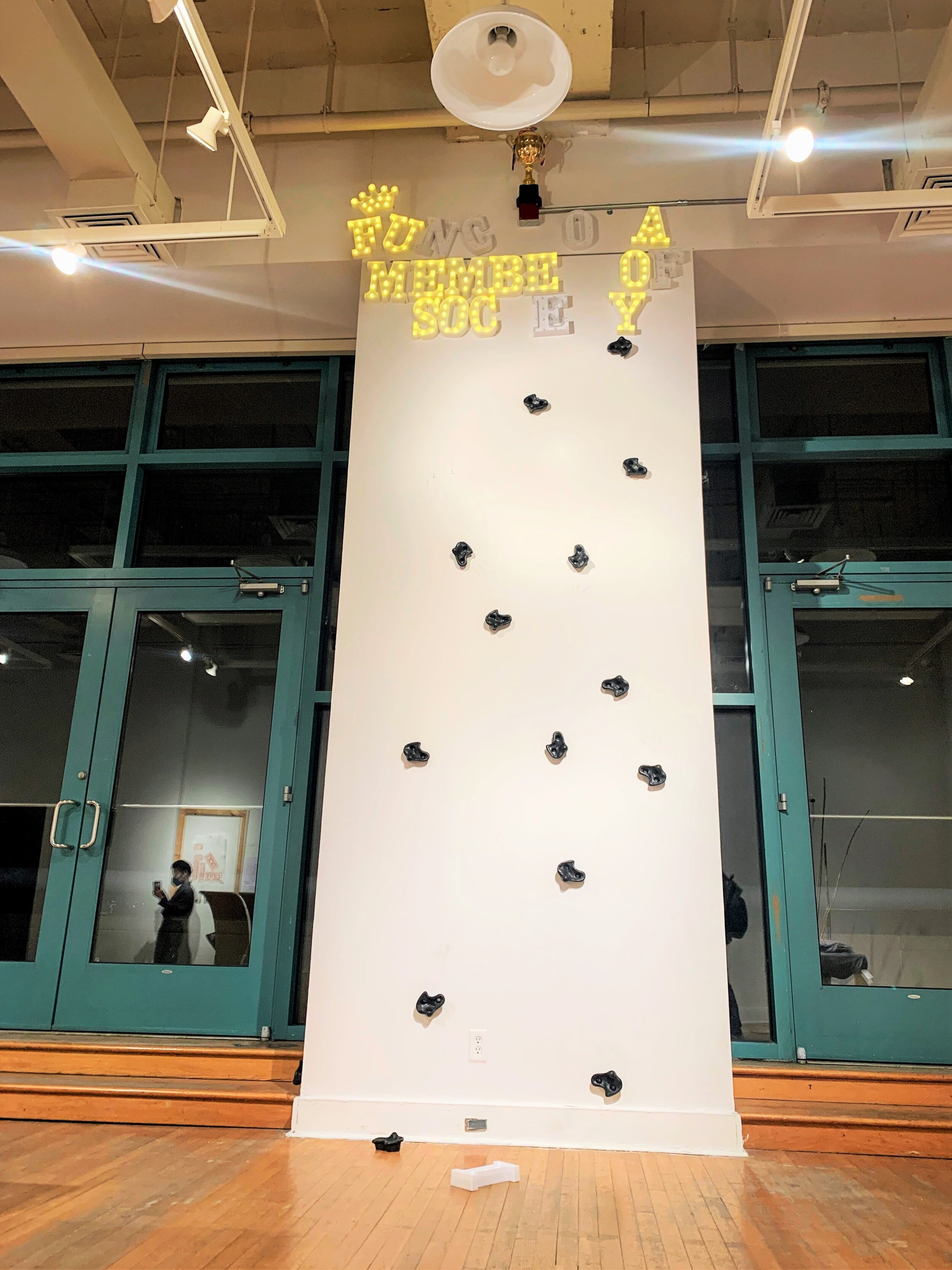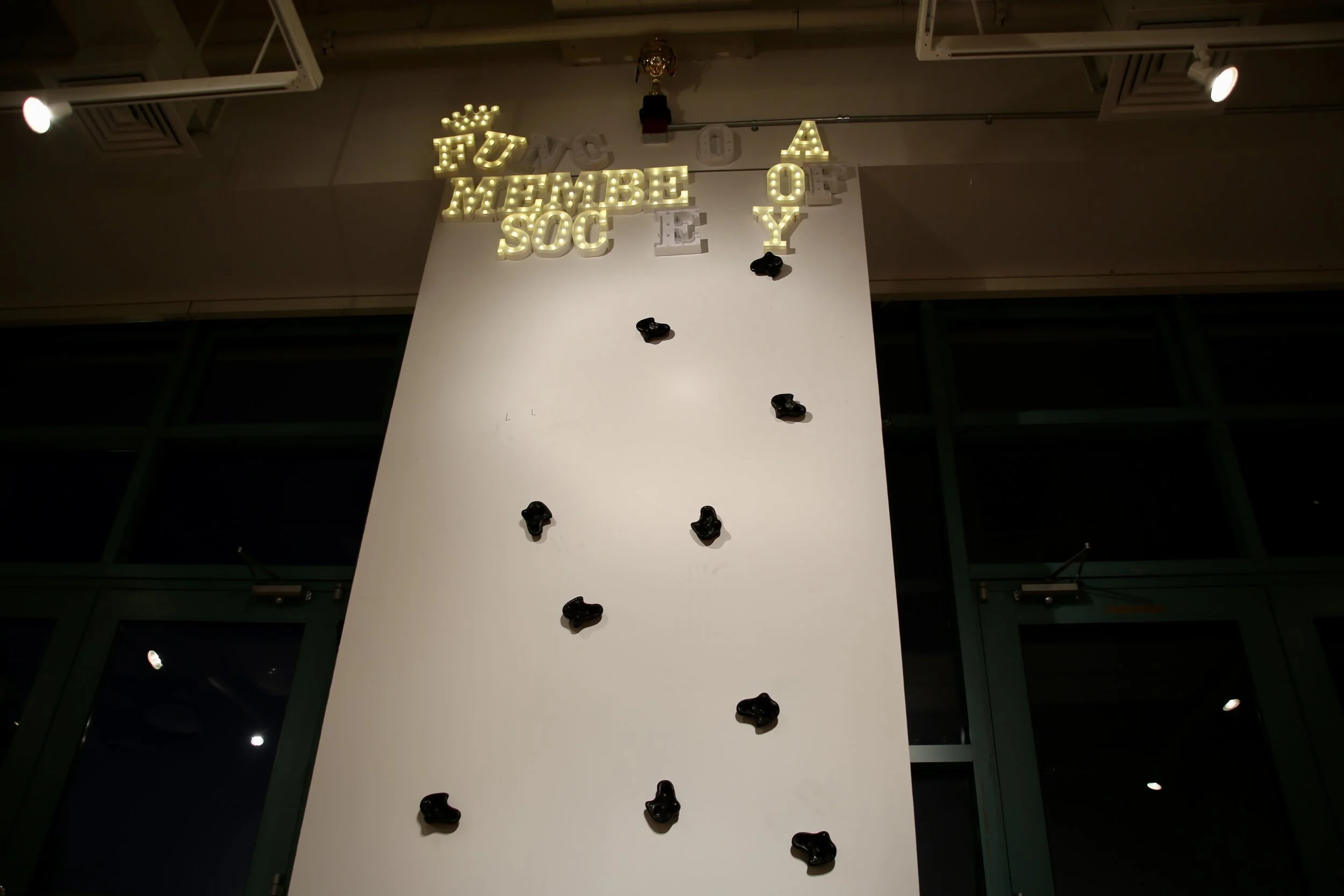 Additional Descriptions: Some Marquee letters to spell out “Functional Member of Society” at the top of the rock climb are missing or do not light up. The “I” from society has fallen and rests at the foot of the climb.
