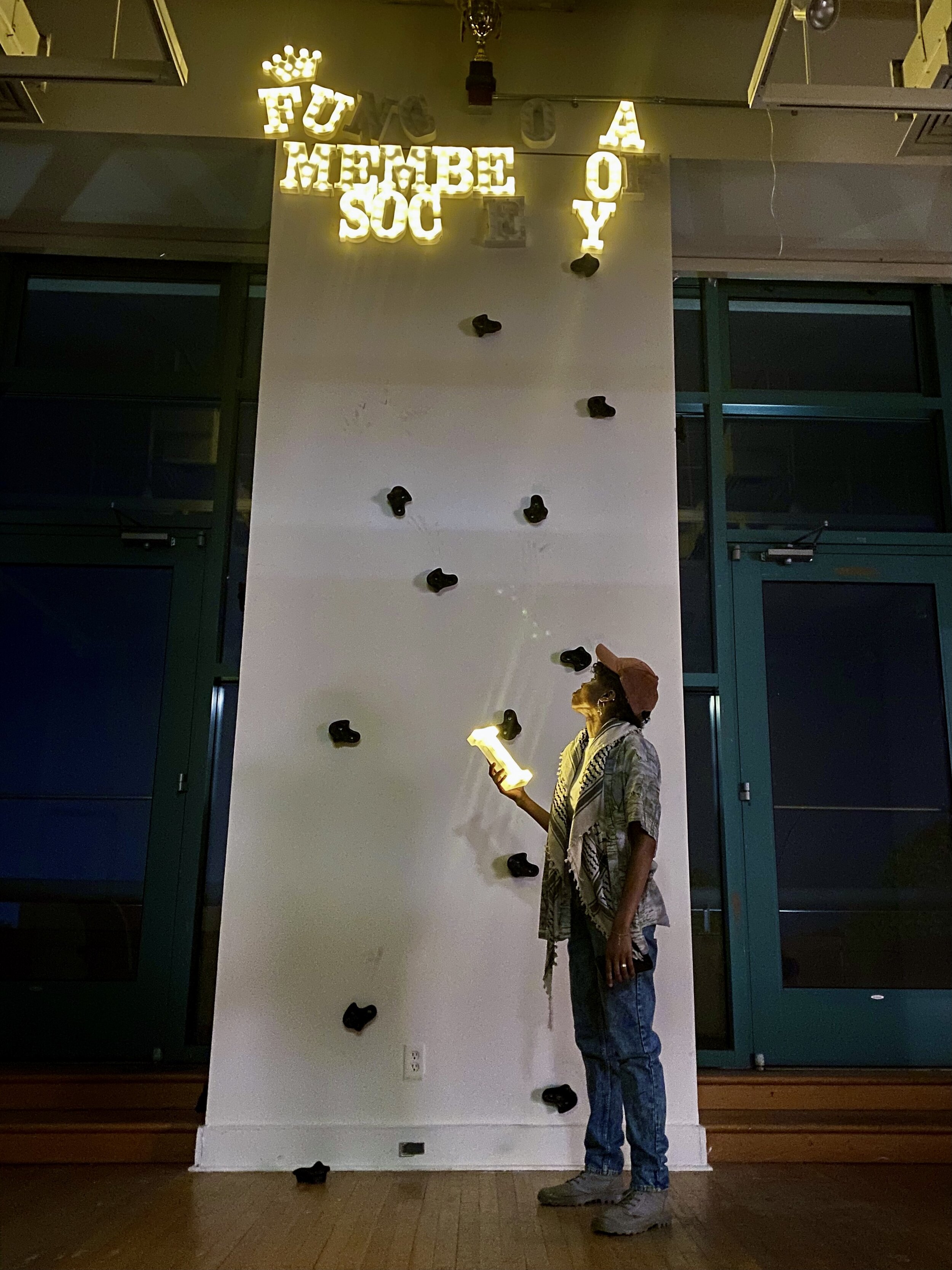 Materials/Techniques: Found objects: Marquee Letters, Rock climb holds, trophy, mark-making