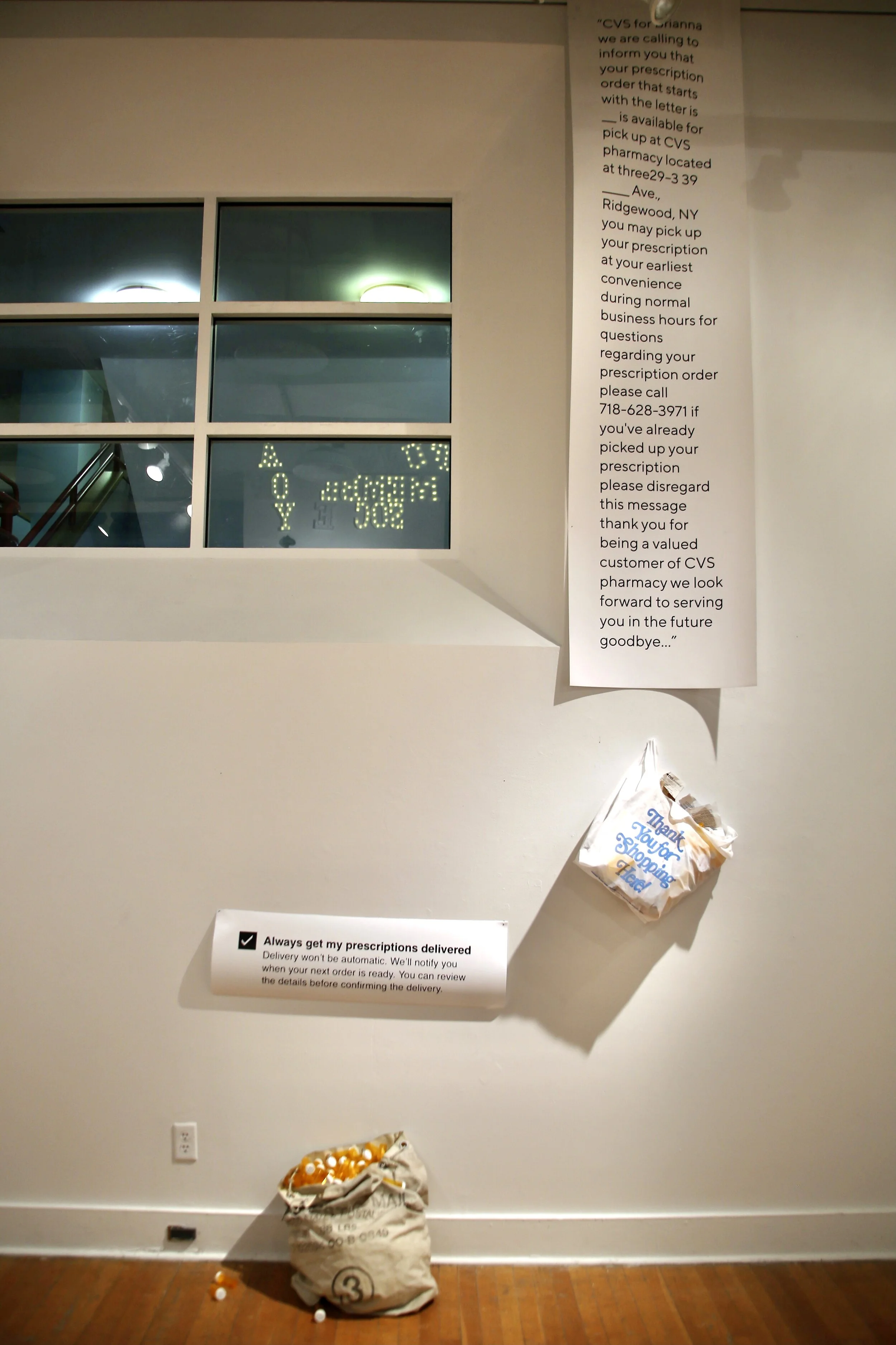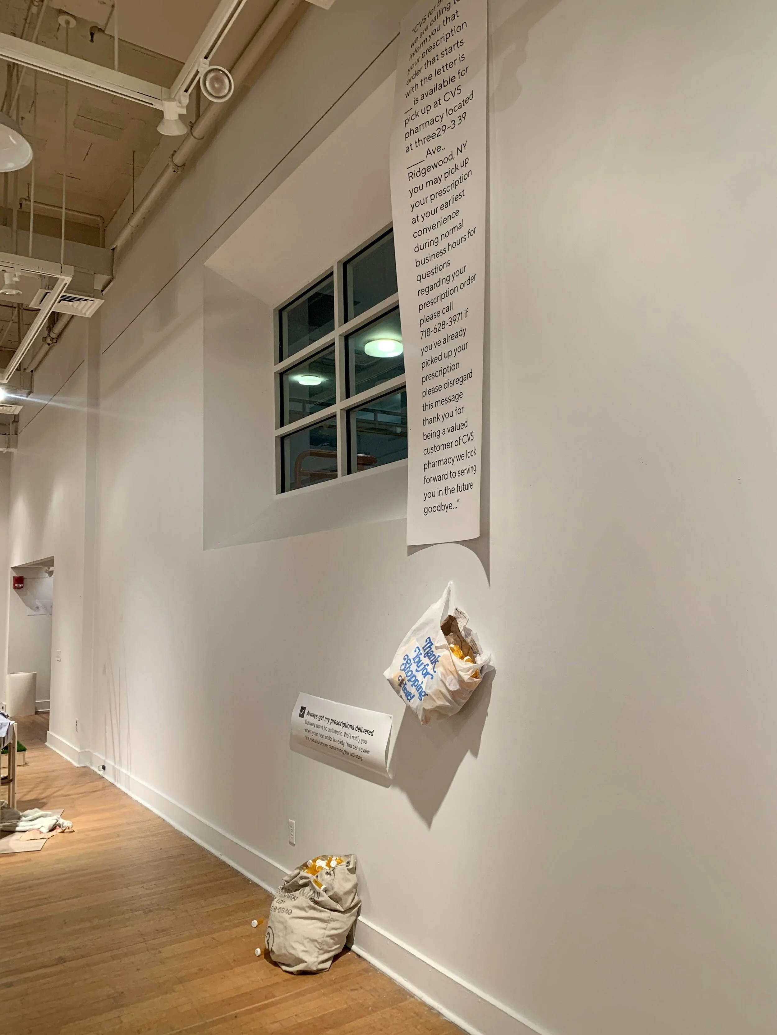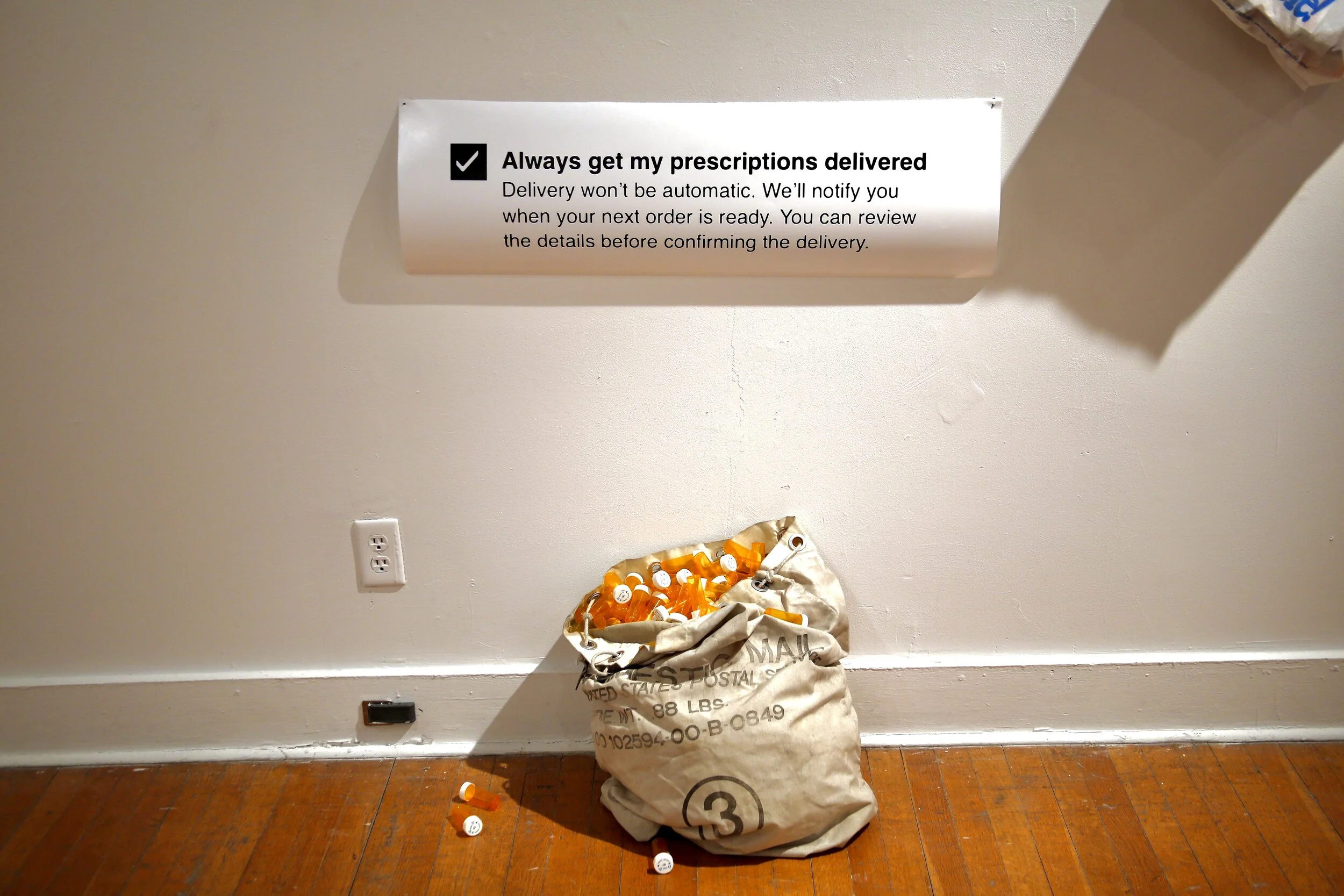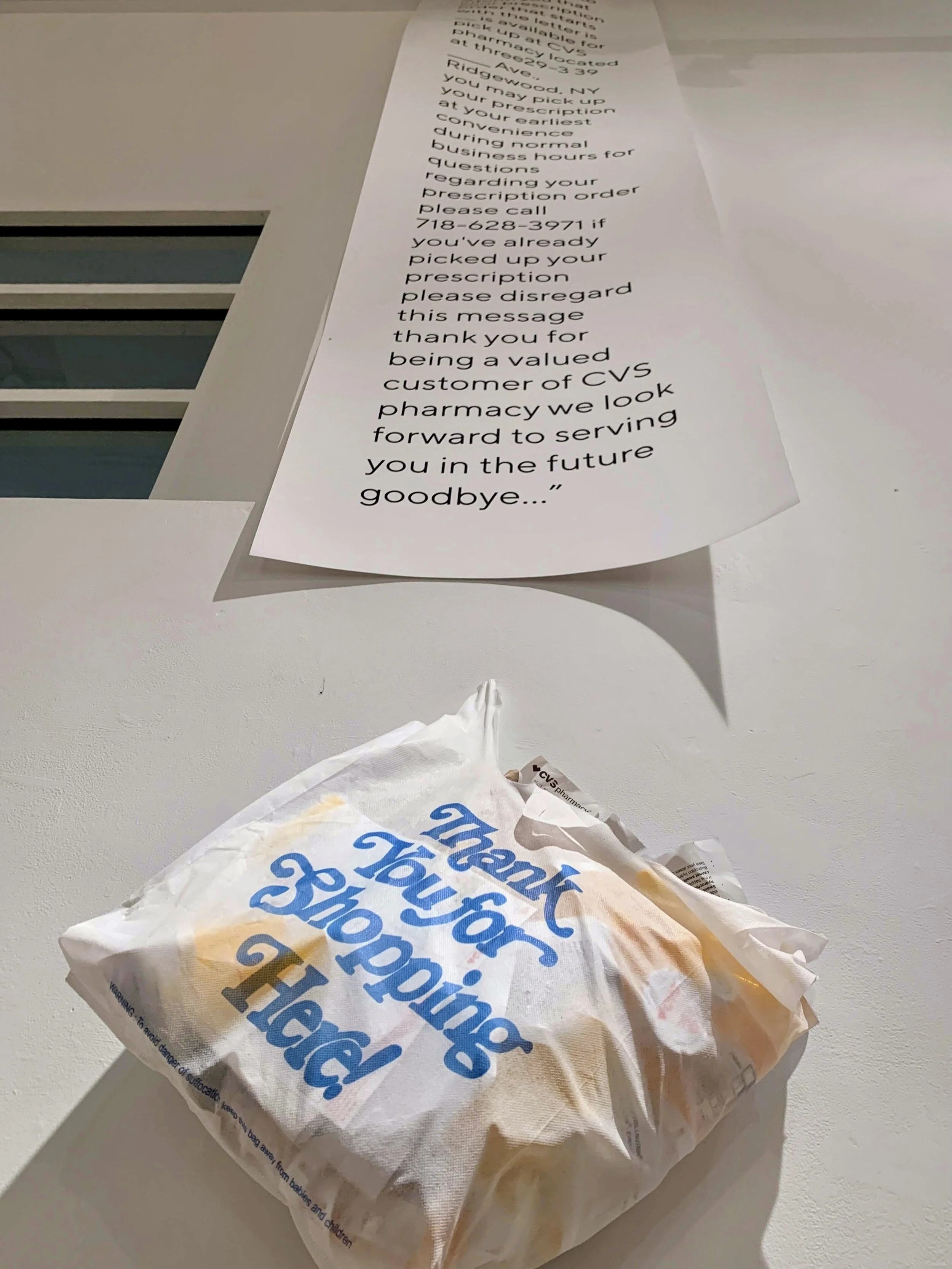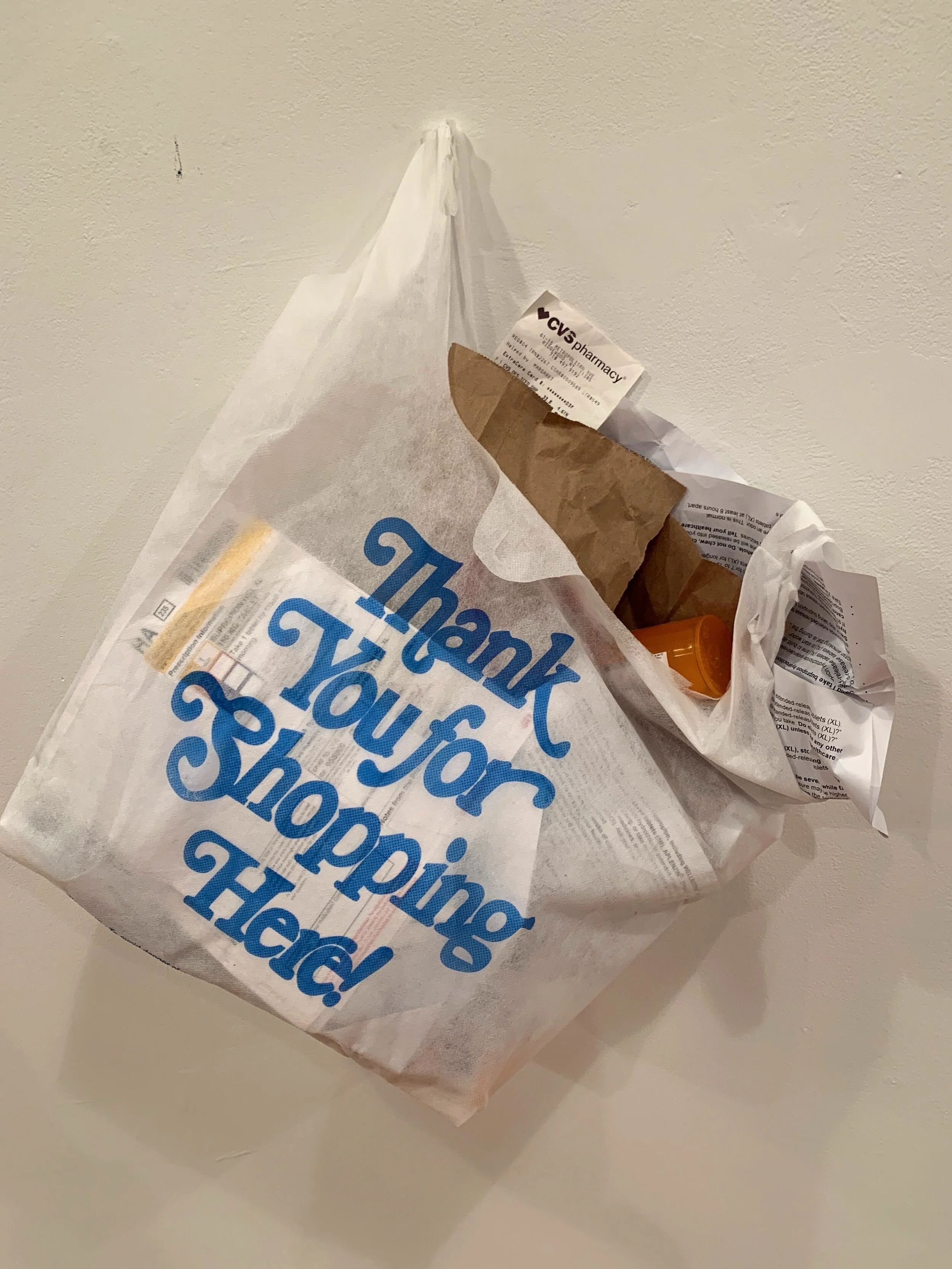 Materials/Techniques: Prescription bottles and prints, fabric shopping bag, US Postal service bag, text