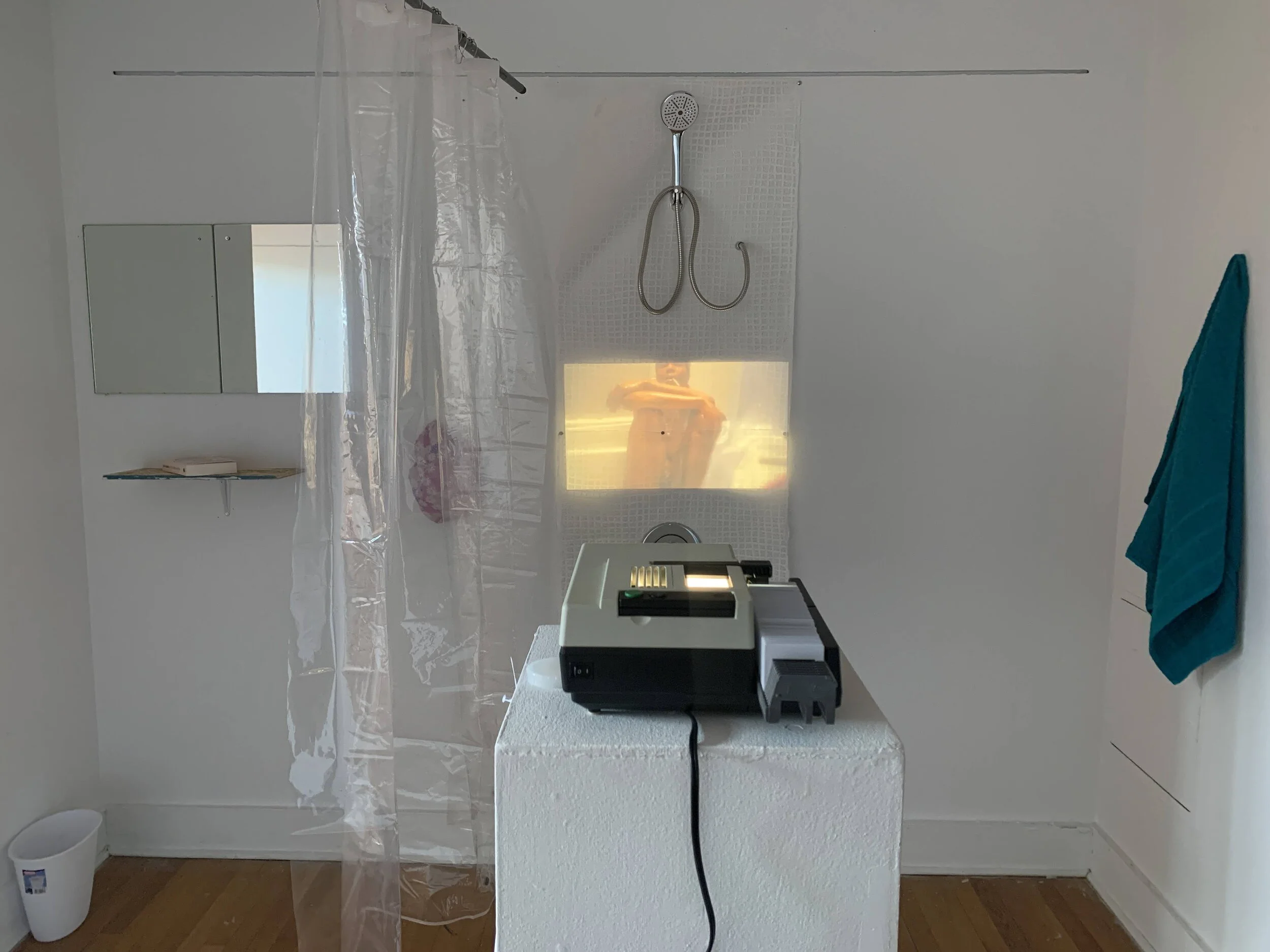 Additional Descriptions: A slide projector displays photos projected inside of a shower in a bathroom built environment.